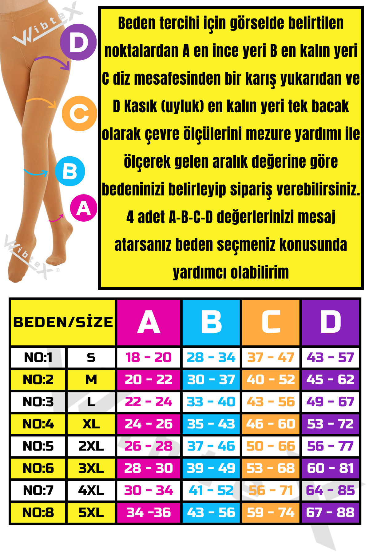 VARİSS ÇORAPLARI ERKEK VE BAYANLAR İÇİN ORTAKLAŞA TASARLANMIŞTIR; Tedavinin etkisi ve devamlılığı için doğru ölçüdeki VARİS çorabını kullanmanız gerekmektedir; İleri derece varislerde ilerlemeyi önler ve tedaviye yardımcı olur; Uyguladığı dereceli basınç sayesinde kanın tek bir noktada birikmesini engelleyerek kan dolaşımının hızlanmasına yardımcı olur; Bacaklardaki yorgunluk hissini azaltır; Uzun yolculuklarda kullanıldığında ödemi engelleyen, rahatlatıcı çoraptır; Gün içinde ayakta kaldığınız sürece VARİSS çorabı ile dolaşılır; VARİSS ÇORABI BEDEN SEÇİMİNİZİ YAPMADAN ÖNCE GEREKLİ BİLGİLER Ürün görselinde olan beden tablosundaki belirtilen bölgelerden ölçüm yapınız; Her iki bacaktan da ölçü alınmalı, not edilerek ürün görselinde bulunan beden tablosundan en uygun aralık seçilmelidir; (Sabah uyanınca alınan ölçü en doğru beden seçimini sağlar) VARİSS ÇORAPLARINDA BEDEN NASIL BELİRLENİR 1; Ayak bileğinin en ince yerinden çevre ölçüsünü alın, ölçüm tablosunda A olarak gösterilir; 2; Alt baldırın en kalın yerinden çevre ölçüsünü alın, ölçüm tablosunda B olarak gösterilir; 3; Üst baldırın en kalın yerinden çevre ölçüsünü alın,ölçüm tablosunda C olarak gösterilir; 4; Kasık bölgesinden tek bacak olarak(kalçanın hemen altından) çevre ölçüsünü alın, ölçüm tablosunda D olarak gösterilir; VARİSS ÇORABI KULLANIRKEN DİKKAT ETMENİZ GEREKENLER; Sabah uyandığınızda çorabınızı giymeden önce sırt üstü uzanıp ayaklarınızı yukarı 2 dakika kaldırın ve sonra giyin; Kirlenen çoraplarınızı asla çamaşır makinasına atmayın; Yıkamayı sadece elde çitilemeden ılık sabunlu su ve ile yapınız; Kurutma işlemini petek, sandalye çamaşır ipi gibi yerlere asmayınız; Düz bir zemine, havlu serip, havlu arasında oda ısısında kurutunuz;