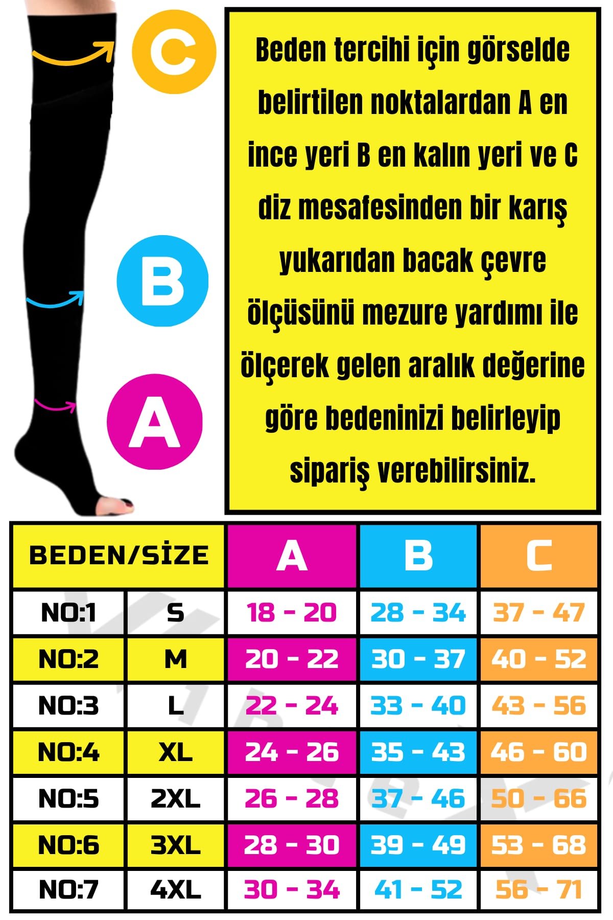 1. Ayak bileğinin en ince yerinden çevre ölçüsünü alın,ölçüm tablosunda A olarak gösterilir.(oturur vaziyette iken)